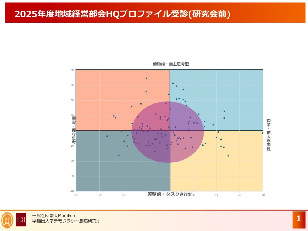 2025年度も残りわずかとなりました。地域経営部会では、部会が始まる前と後にアセスメントツールであるHQプロファイルを参加者の皆様にご受診いただきます。このツールにより、研究会の効果測定をします。数値で可視化し、且つその数値をグラフにすることによりビジュアルで効果が測れます。